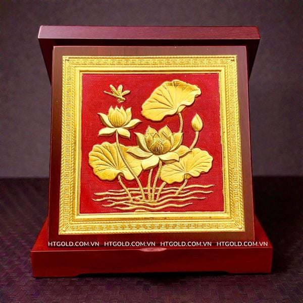 Bức hoa sen nổi bật trên nền đỏ cát tường, kết hợp sắc vàng óng ánh, mang lại cảm giác an yên, trang trọng và ấm áp.