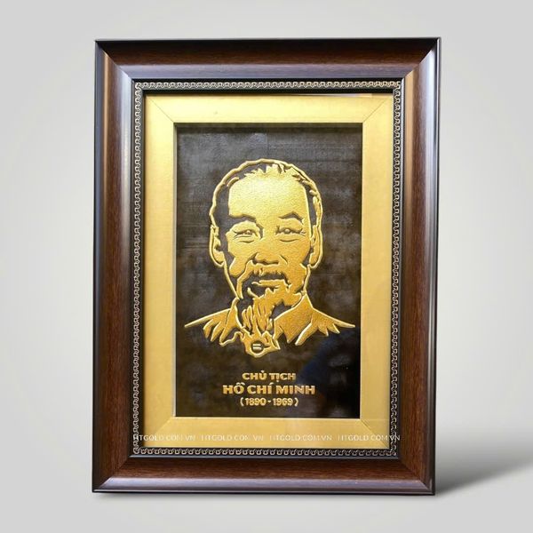 Tranh chân dung Bác Hồ bằng đồng, bề mặt tranh được dát vàng, kích thước 32cm x 42cm mô phỏng chân thực hình ảnh Bác Hồ với khuôn mặt tươi sáng rạng ngời. Sản phẩm tranh đồng của HTgold được chạm tay thủ công tinh xảo, sắc nét và rất độc đáo. Tranh đồng chân dung Bác Hồ là quà tặng lưu niệm mang dấu ấn dân tộc sâu sắc có thể trưng bày trong gia đình, trong phòng làm việc nhằm tỏ lòng thành kính đối với vị lãnh tụ vĩ đại của đất nước, thường được đặt ở những nơi trang trọng thể hiện sự biết ơn, tưởng nhớ tới Bác. Đặc biệt là các sự kiện chính trị, ngoại giao quan trọng. Đây cũng là cách để con cháu ngàn đời thể hiện lòng biết ơn sâu sắc, sự tưởng nhớ và kính trọng đối với vị lãnh tụ vĩ đại của dân tộc Việt Nam ta.