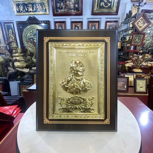 Tranh chân dung Đại tướng Võ Nguyên Giáp bằng đồng kích thước 20cm x 25cm tái hiện chân thực hình ảnh Bác Giáp với khuôn mặt tươi sáng rạng ngời. Tranh được chạm tay thủ công tinh xảo, sắc nét và rất độc đáo. Tranh đồng chân dung Đại tướng Võ Nguyên Giáp là quà tặng lưu niệm mang dấu ấn dân tộc sâu sắc có thể trưng bày trong gia đình, trong phòng làm việc nhằm tỏ lòng thành kính đối với một vị tướng vĩ đại của đất nước, thường được đặt ở những nơi trang trọng thể hiện sự biết ơn, tưởng nhớ tới người có công lao to lớn với đất nước. Đây cũng là cách để con cháu ngàn đời thể hiện lòng biết ơn sâu sắc, sự tưởng nhớ và kính trọng đối với vị tướng đại tài của dân tộc Việt Nam ta.