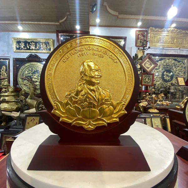 Tranh chân dung Đại tướng Võ Nguyên Giáp bằng đồng, dát vàng, kích thước 20cm, tổng chiều cao 25cm, tranh được chạm tay thủ công tinh xảo, sắc nét và rất độc đáo. Thiết kế nhỏ gọn thích hợp bài trí bàn phòng khách, kệ tủ hoặc bàn làm việc đẹp và ý nghĩa. Tranh chân dung Bác Võ Nguyên Giáp bằng đồng, dát vàng là quà tặng lưu niệm được ưa chuộng trưng bày trong gia đình, cơ quan, trường học, trụ sở chính quyền nhằm tỏ lòng thành kính đối với vị tướng đại tài của dân tộc.