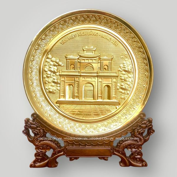 Tranh đĩa đồng Văn Miếu – Xích Đằng mạ vàng, đường kính 25cm, được chế tác từ đồng nguyên bản cao cấp, các hoạ tiết hoa văn được chạm khắc hoàn toàn thủ công với độ tỉ mỉ – sắc nét – tinh xảo đến từng chi tiết.