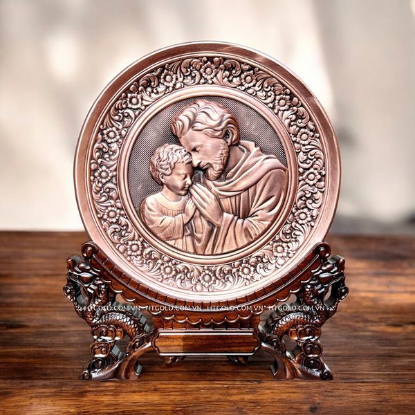 Tranh đồng Công Giáo - Thánh Giuse bên Chúa là bức tranh đĩa bằng đồng mô phỏng hình ảnh thánh Giuse bế Chúa, một tay cầm nhánh hoa huệ. Đây là hình ảnh phổ biến trong đạo Công Giáo. Bức tranh được chế tác theo kiểu dáng đĩa tròn, cứng cáp, có chân đế rồng bằng gỗ mun dễ dàng trưng bày ở bất cứ đâu. Không chỉ là một bức tranh đơn thuần, tranh còn mang nhiều ý nghĩa thiêng liêng với những người theo đạo Công Giáo.