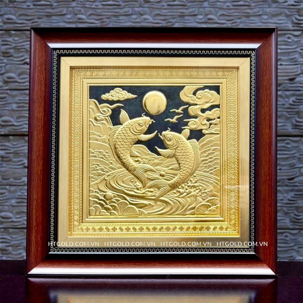 Bức tranh được chế tác từ đồng vàng nguyên chất, trải qua quá trình gia công công phu bởi các nghệ nhân lành nghề. Toàn bộ họa tiết được chạm khắc thủ công tỉ mỉ, từng đường nét vảy cá, sóng nước, mây trời và ánh trăng đều hiện lên sắc nét, có chiều sâu và sống động.