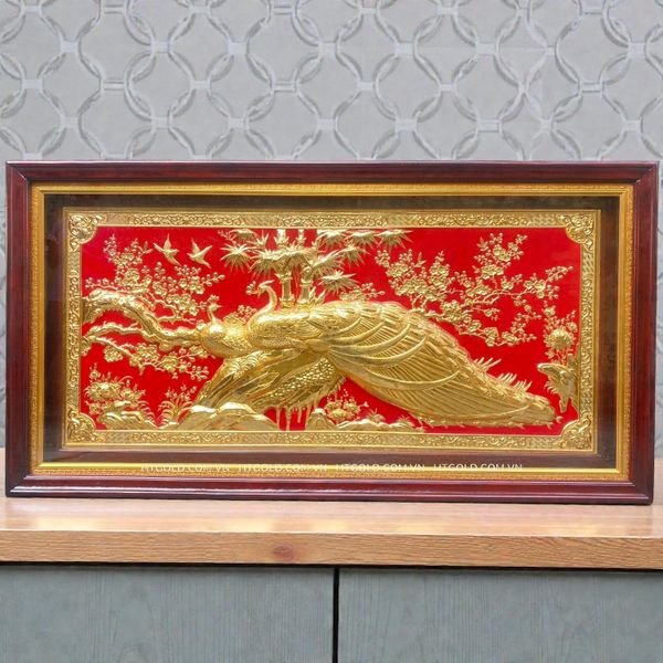 Tranh đồng Vinh Hoa Phú Quý dát vàng tái hiện hình ảnh chim công – loài chim biểu trưng cho phú quý, danh vọng và hạnh phúc viên mãn. Công trống – công mái sánh đôi thể hiện sự hòa hợp, sung túc và thịnh vượng lâu dài.